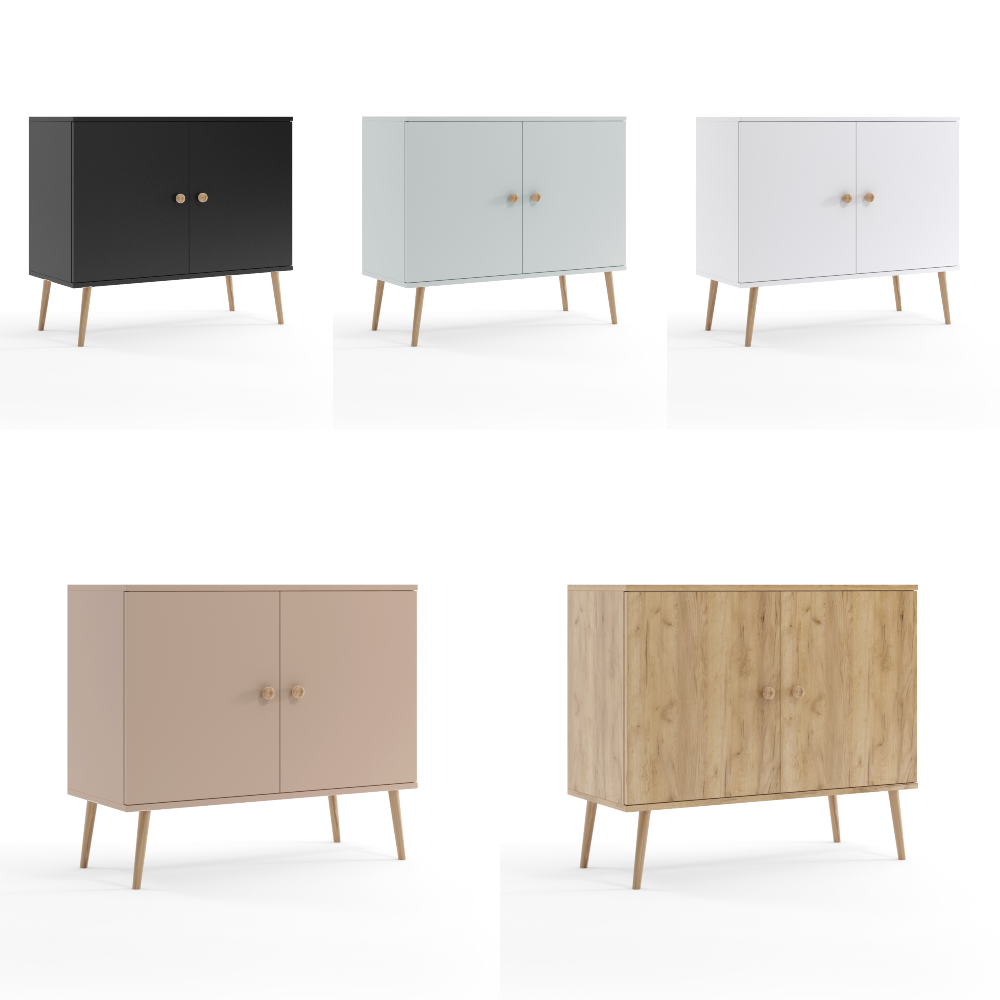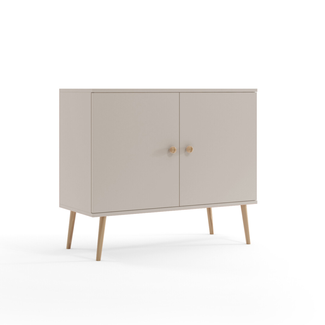 Komoda posiada 4 nogi z litego drewna bukowego, które kolorystycznie pasuje do pozostałych mebli z kolekcji. Nogi sztywno zamocowane są do konstrukcji mebla, co sprawia że nie uszkodzą się nawet podczas przesuwania po podłożu.