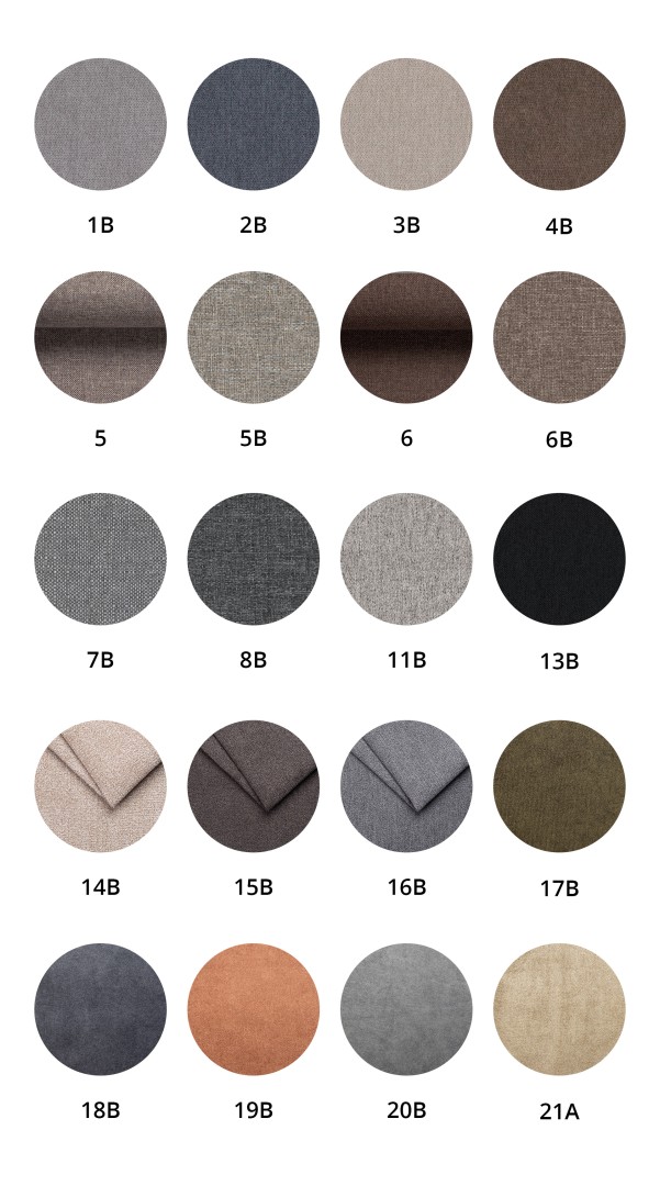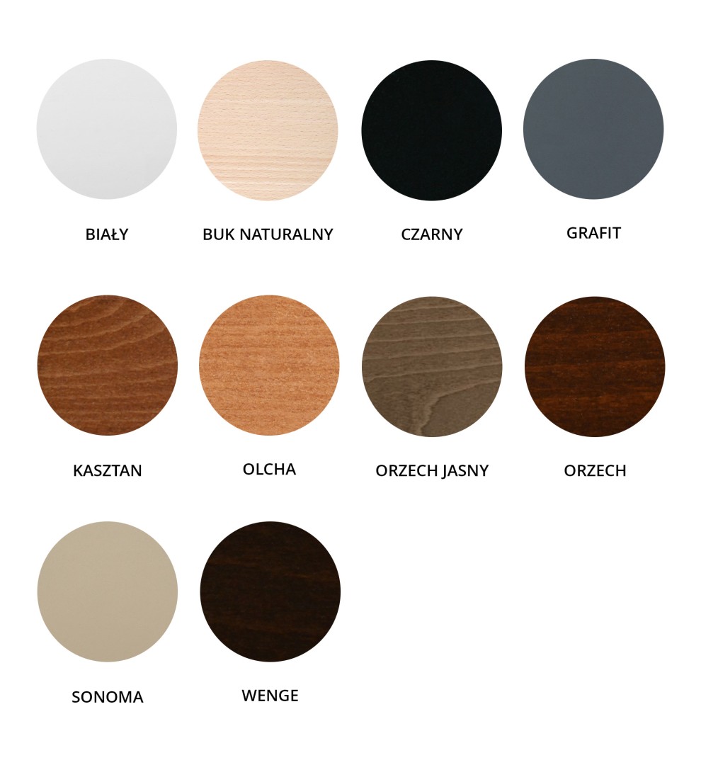 - Drewna: biały, buk naturalny, czarny, grafit, kasztan, olcha, orzech jasny, orzech, sonoma, wenge.