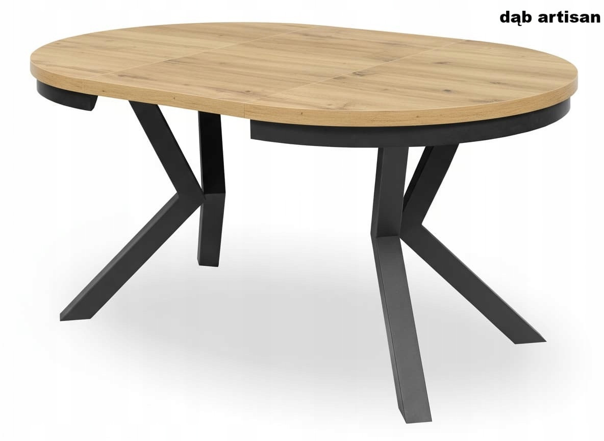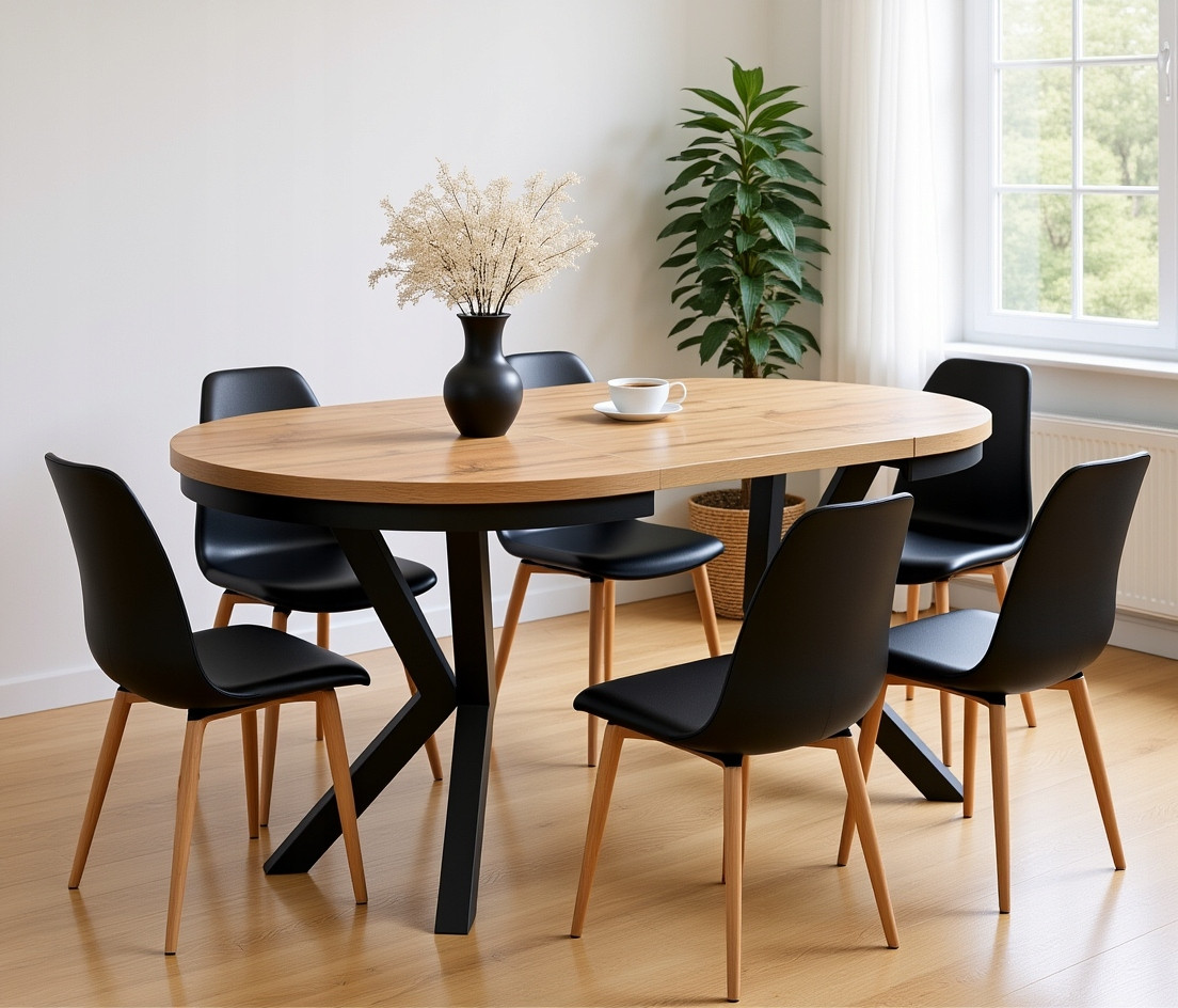 Stół loftowy rozkładany z metalowymi nogami typu X to połączenie solidności, funkcjonalności i ponadczasowego stylu industrialnego. Nowoczesny design i kontrastowe zestawienie czarnych metalowych nóg oraz stylowej metalowej obręczy z blatem w naturalnym odcieniu Dąb Kora sprawia, że stół doskonale wpisuje się w aranżacje loftowe, skandynawskie i minimalistyczne.