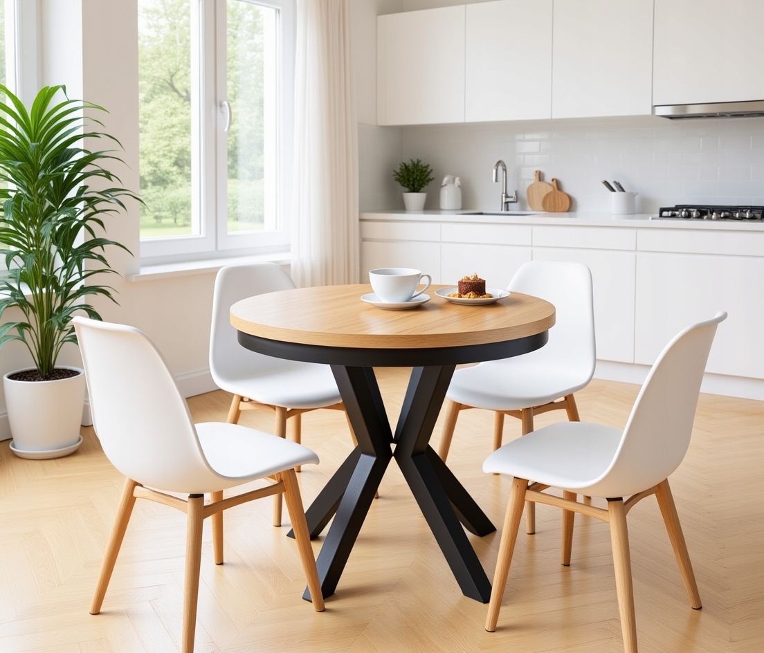 Okrągły blat sprzyja rozmowie, wszyscy siedzą w równym dystansie, nikt nie kończy stołu, dlatego atmosfera posiłku staje się mniej formalna. To także bezpieczniejsze rozwiązanie, gdy w domu mieszkają dziecibrak ostrych krawędzi ogranicza ryzyko uderzenia.