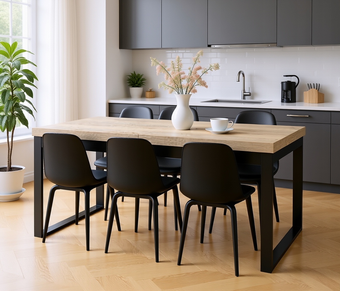 Stół loftowy rozkładany z metalowymi nogami typu U to połączenie solidności, funkcjonalności i ponadczasowego stylu industrialnego. Nowoczesny design oparty na prostych liniach i kontrastowym zestawieniu czarnych metalowych nóg z blatem w odcieniu Dąb Halifax Cynowany sprawia, że stół doskonale wpisuje się w aranżacje loftowe, skandynawskie i minimalistyczne.