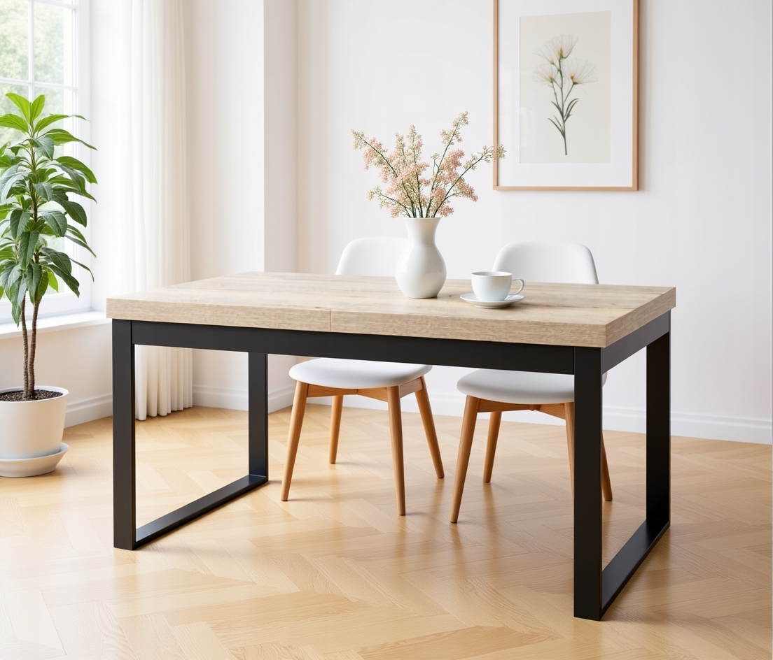 Stół loftowy rozkładany z metalowymi nogami typu U to połączenie solidności, funkcjonalności i ponadczasowego stylu industrialnego. Nowoczesny design oparty na prostych liniach i kontrastowym zestawieniu czarnych metalowych nóg z blatem w odcieniu Dąb Lancelot sprawia, że stół doskonale wpisuje się w aranżacje loftowe, skandynawskie i minimalistyczne.