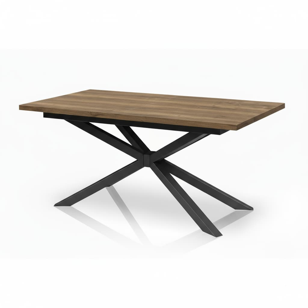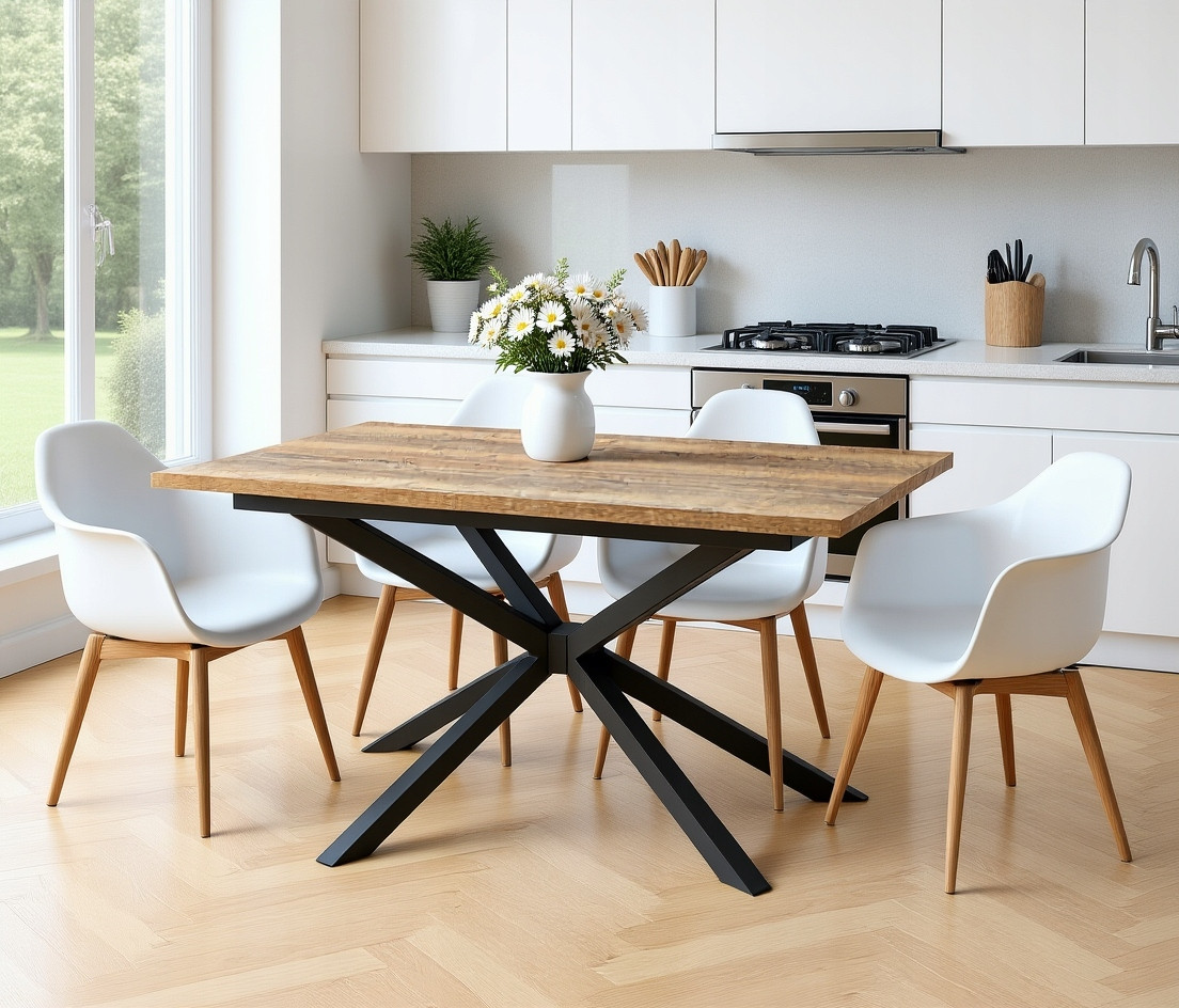 Blat wykonany jest z wysokiej jakości płyty laminowanej o grubości 36 mm, odpornej na zarysowania, wilgoć i wysokie temperatury. Zabezpieczony okleiną ABS, zachowuje swój elegancki wygląd przez wiele lat użytkowania. Metalowe nogi typu Pająk, malowane proszkowo, gwarantują wyjątkową stabilność i podkreślają industrialny charakter stołu.