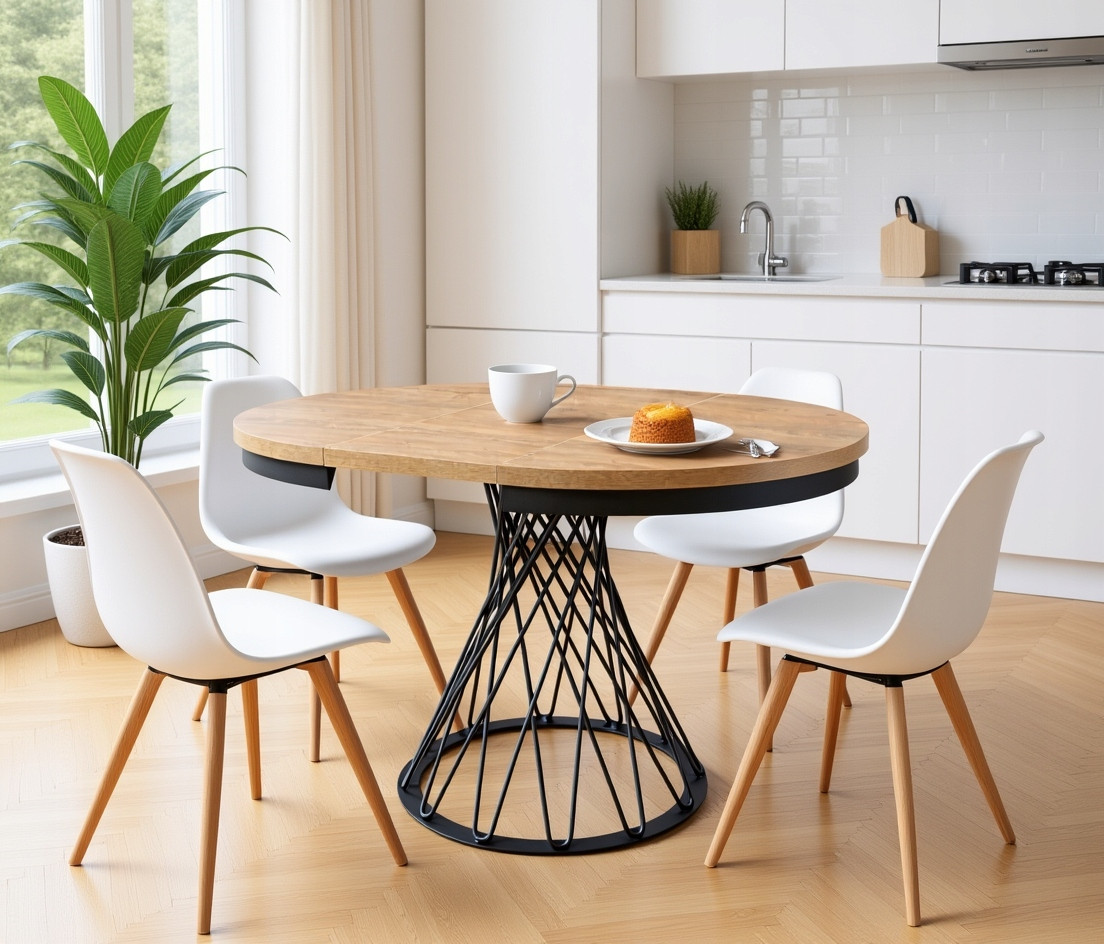Okrągły blat sprzyja rozmowie, wszyscy siedzą w równym dystansie, nikt nie kończy stołu, dlatego atmosfera posiłku staje się mniej formalna. To także bezpieczniejsze rozwiązanie, gdy w domu mieszkają dzieci — brak ostrych krawędzi ogranicza ryzyko uderzenia.