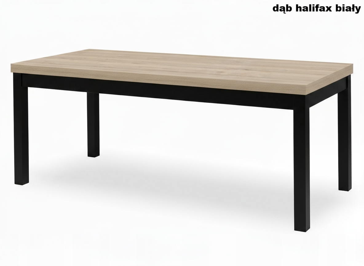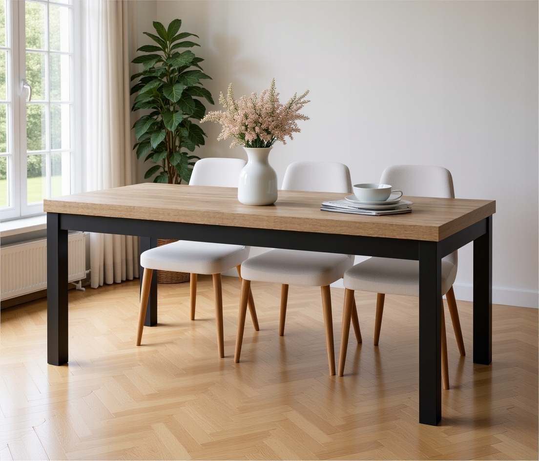 Stół loftowy rozkładany z drewnianymi nogami to połączenie solidności, funkcjonalności i ponadczasowego stylu industrialnego. Nowoczesny design oparty na prostych liniach i kontrastowym zestawieniu czarnych drewnianych nóg z blatem w kolorze Dąb Halifax Biały sprawia, że stół doskonale wpisuje się w aranżacje loftowe, skandynawskie i minimalistyczne.